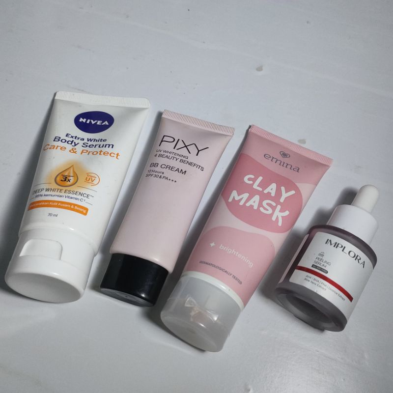 - preloved nivea body serum, bb cream pixy, emina clay mask, implora peeling serum